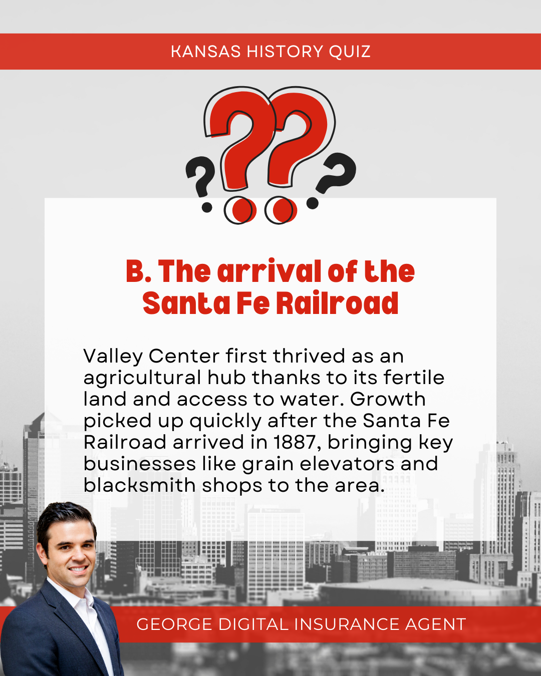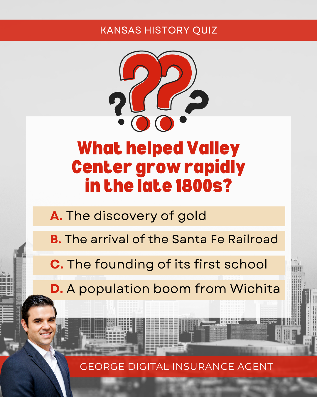 Instagram Caption: Think you know what kicked off Valley Center’s early growth? Let’s put your local history knowledge to the test. #funfactfriday #valleycenterks #GeorgeDigitalInsuranceAgent